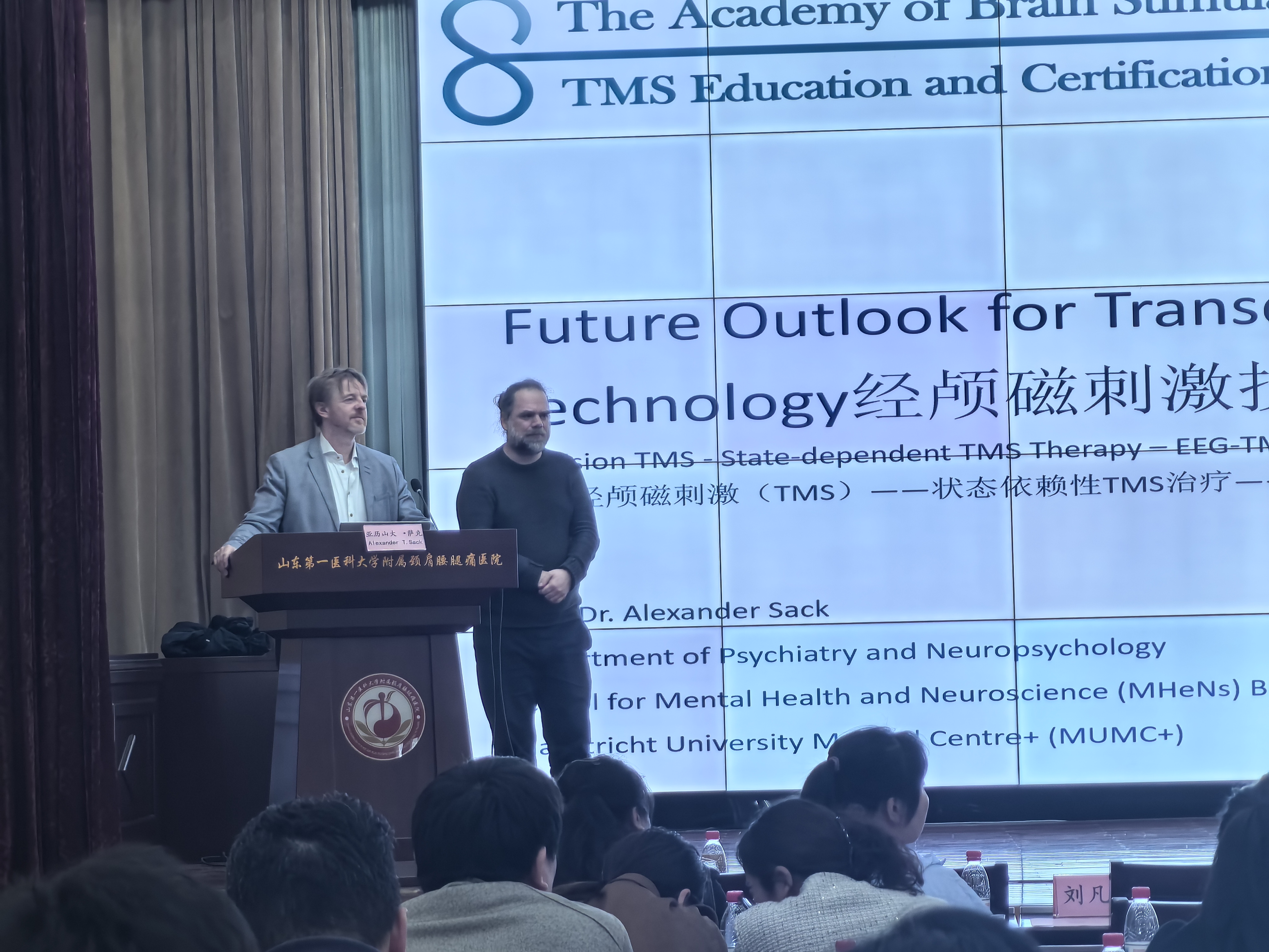 本次培训班课程设置紧凑高效、干货满满,全程围绕经颅磁技术核心内容展开系统化教学,兼具理论深度与实践操作性。荷兰马斯特里赫特大学跨学院整合神经科学中心(CIN)主任亚历山大·萨克教授,率先带来经颅磁基础理论专题讲解,深入阐释技术原理、核心应用方向,为参会学员筑牢理论根基;随后菲力克斯·杜克教授围绕经颅磁临床应用、操作规范、禁忌症把控及临床常见误区进行细致解读,切实解决临床实操中的关键问题。亚历山大·萨克教授聚焦经颅磁技术未来发展前景,深入讲解精准磁刺激、深部磁刺激及多模态联合应用等前沿内容,拓宽学员学术视野,明晰技术发展方向。