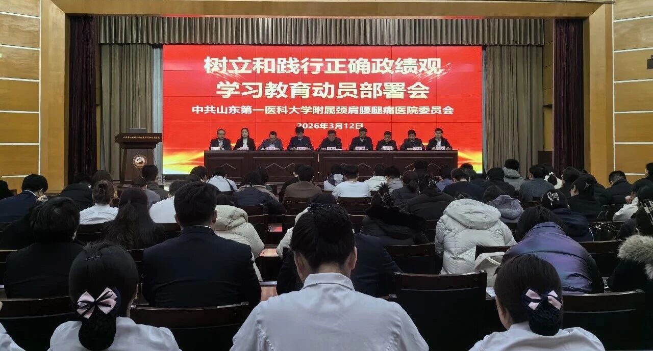 2026年3月12日,山东第一医科大学附属颈肩腰腿痛医院召开树立和践行正确政绩观学习教育动员部署会,深入贯彻落实党中央、省委及校(院)党委关于树立和践行正确政绩观的决策部署,对全院学习教育工作进行全面安排和系统部署。医院领导班子成员、各党支部书记、各科室负责人及党员、群众代表参加会议,会议由党委副书记刘凡杰主持,党委书记张洪彬作动员讲话。