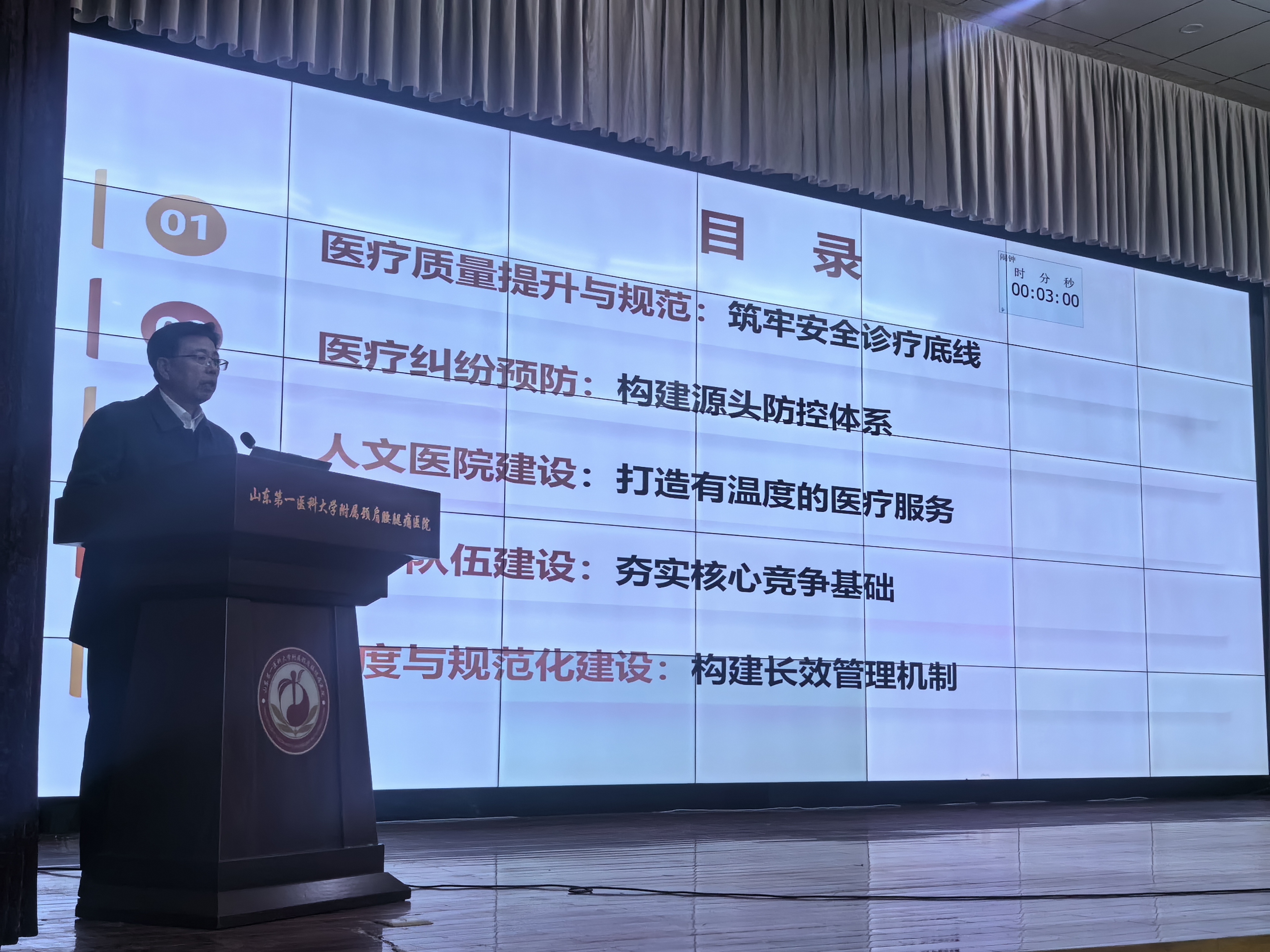 最后,院长师彬结合专题课件作总结讲话。师院长以 “医疗质量提升与制度化规范化建设” 为核心,从五大维度系统部署未来工作:一是筑牢安全诊疗底线,构建 “院级-科室-个人” 三级质控体系,完善标准化诊疗流程与患者安全闭环管理;二是构建医疗纠纷源头防控体系,通过落实核心制度、优化医患沟通、强化风险预警,实现从被动应对到主动预防的转变;三是深化人文医院建设,传承中医药 “天人合一” 理念,打造有温度的差异化医疗服务品牌;四是夯实人才队伍根基,构建 “带头人+骨干+青年梯队” 金字塔团队,完善 “传帮带” 培养机制与绩效激励体系;五是健全长效管理机制,推动 “人管人” 向 “制度管人” 转变,实现管理效能持续提升。师院长强调,全院需以 “真抓实干、务实奋进” 的作风,聚焦 “质量过硬、规范有序、服务暖心、学科领先” 目标,为患者提供更优质的医疗服务。