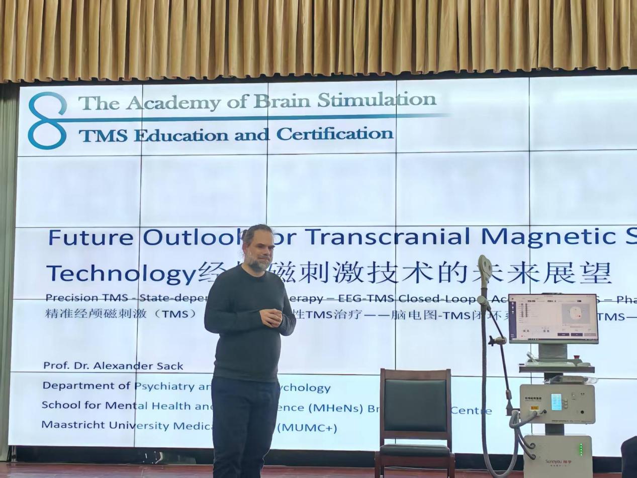 本次培训班课程设置紧凑高效、干货满满,全程围绕经颅磁技术核心内容展开系统化教学,兼具理论深度与实践操作性。荷兰马斯特里赫特大学跨学院整合神经科学中心(CIN)主任亚历山大·萨克教授,率先带来经颅磁基础理论专题讲解,深入阐释技术原理、核心应用方向,为参会学员筑牢理论根基;随后菲力克斯·杜克教授围绕经颅磁临床应用、操作规范、禁忌症把控及临床常见误区进行细致解读,切实解决临床实操中的关键问题。亚历山大·萨克教授聚焦经颅磁技术未来发展前景,深入讲解精准磁刺激、深部磁刺激及多模态联合应用等前沿内容,拓宽学员学术视野,明晰技术发展方向。